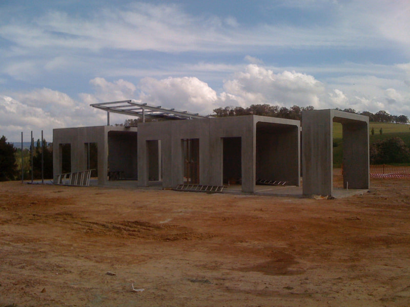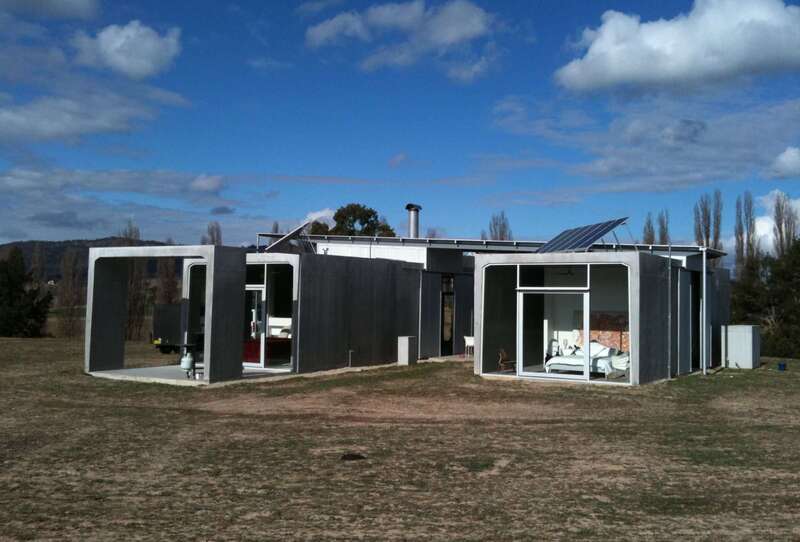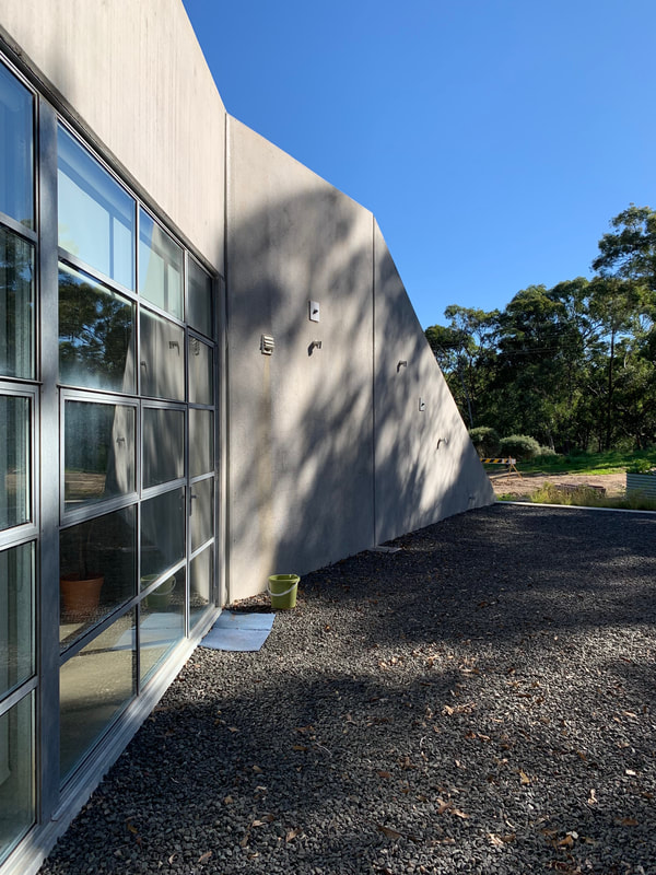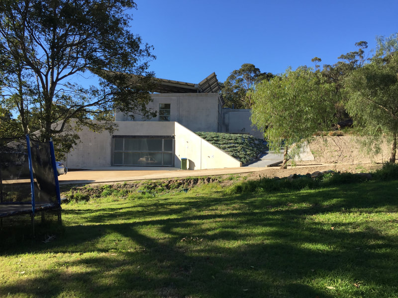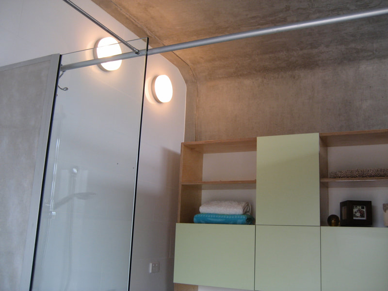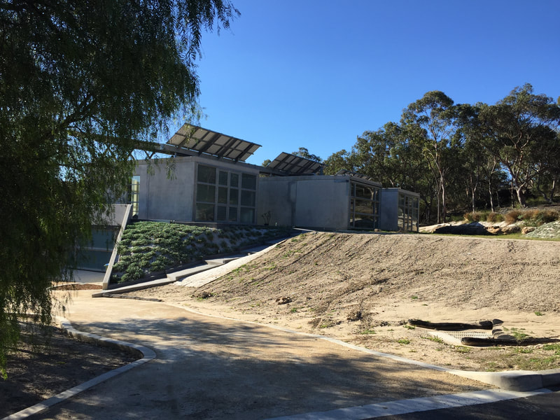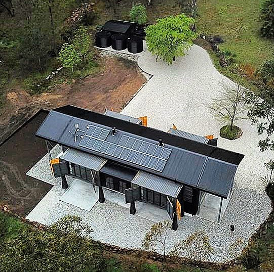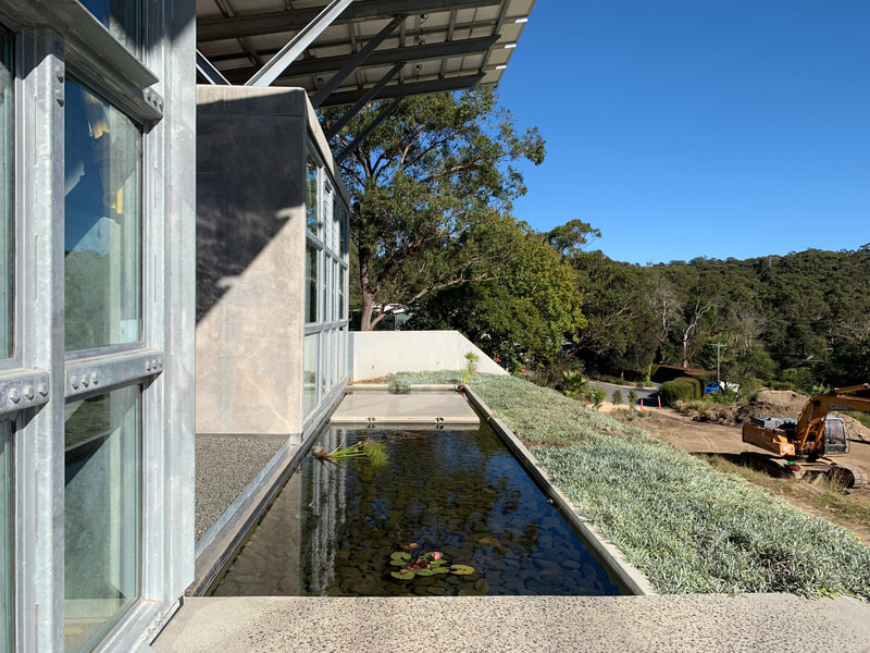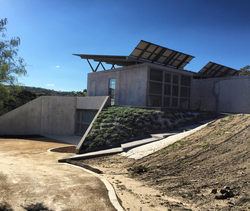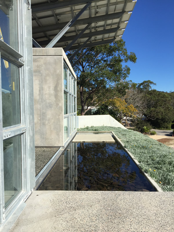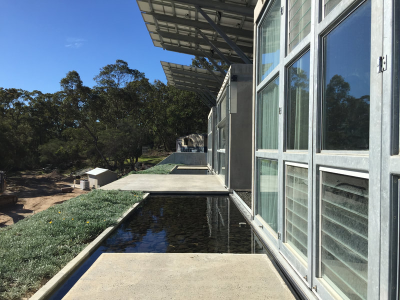 Despite being built from concrete which itself is high in embodied energy, the dwelling will stand the test of time. The passive solar aspects of this design will not be fully realized until the fiber cement shade awnings are installed along the north and west walls and large curtains hang over the exposed glass areas. Stainless steel cables are embedded on the external facade, for a future green wall. The existing dam supplies water to the newly planted orchard and gardens. Surprisingly little waste was generated during the build partly due to the prefabricated nature of this building. Having a small footprint the house is heated by hydronic underfloor heating. With 2 slow combustion heaters providing ambiance. The house runs from a 3.5kW stand alone solar system so hair dryers and toasters are a thing of the past. |
