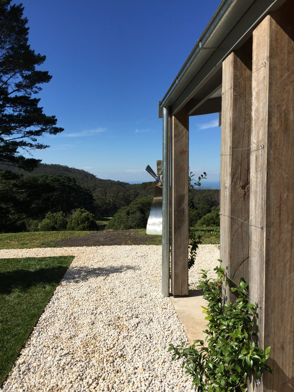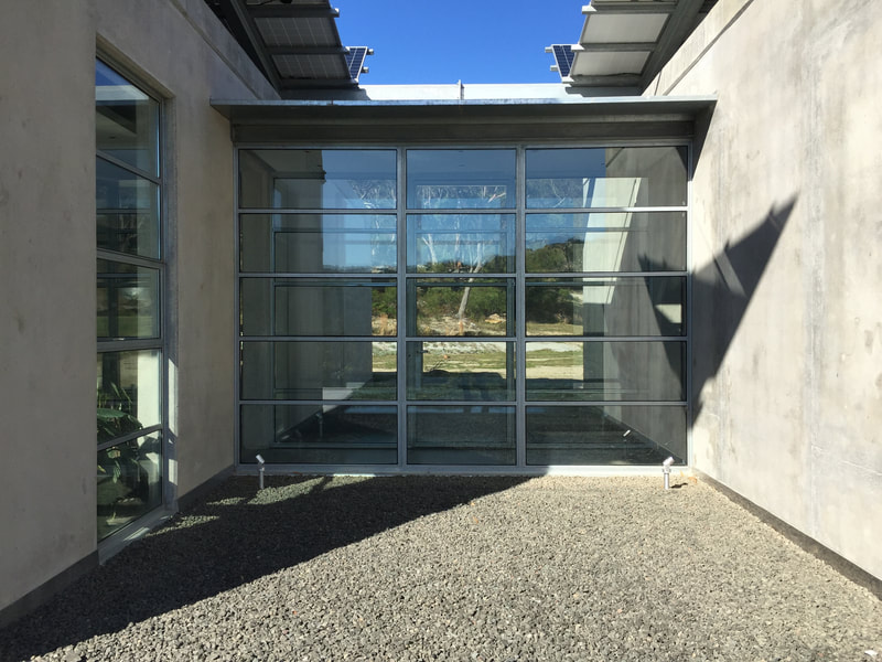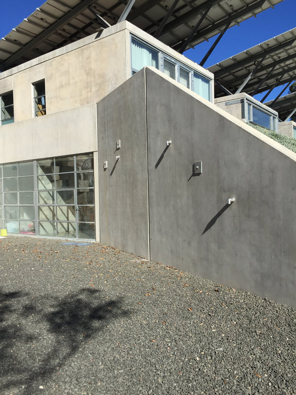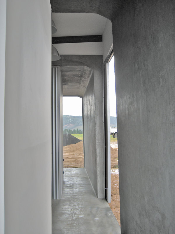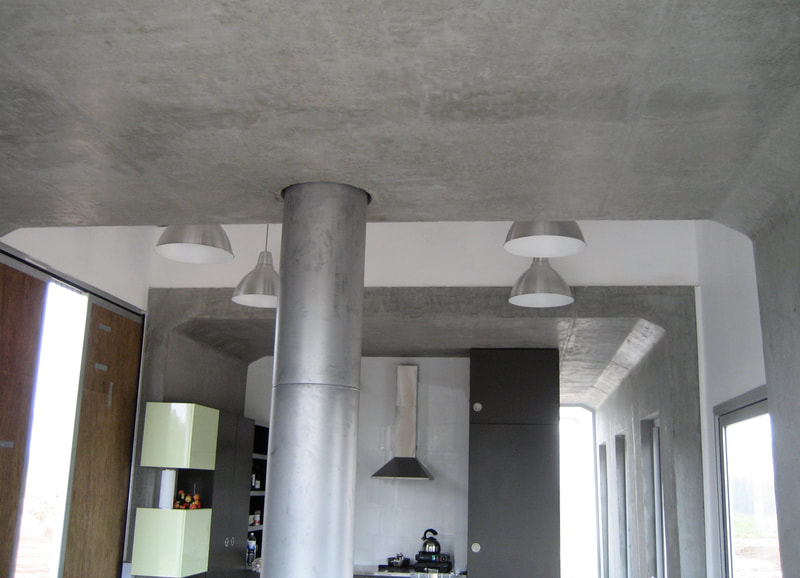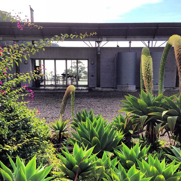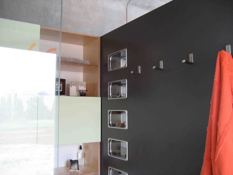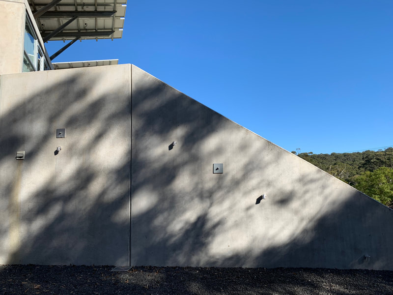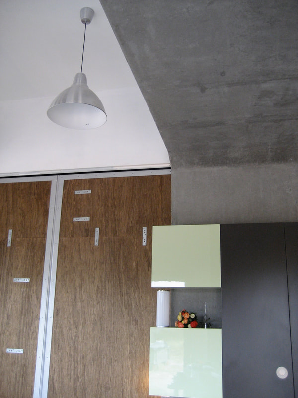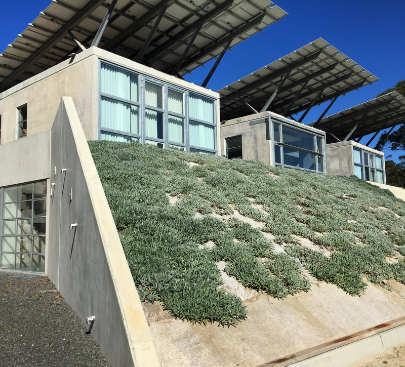 Despite being built from concrete which itself is high in embodied energy, the dwelling will stand the test of time. The passive solar aspects of this design will not be fully realized until the fiber cement shade awnings are installed along the north and west walls and large curtains hang over the exposed glass areas. Stainless steel cables are embedded on the external facade, for a future green wall. The existing dam supplies water to the newly planted orchard and gardens. Surprisingly little waste was generated during the build partly due to the prefabricated nature of this building. Having a small footprint the house is heated by hydronic underfloor heating. With 2 slow combustion heaters providing ambiance. The house runs from a 3.5kW stand alone solar system so hair dryers and toasters are a thing of the past. |
