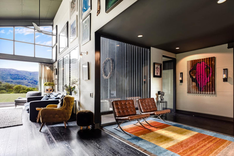 Pass through the gates onto the 5 acre residence, and the drama continues, as woodland peels away to reveal the house itself; an instantly grand, yet contemporary take on a traditional black barn, framed against arguably the most iconic view of Barrengarry Mountain the area has to offer. Black Star has been thoughtfully designed to maximize the beauty of the valleys contrasting seasons: from the snug warmth of its iconic central fireplace on a cold winter night, to its ingenious bi-fold doors that open up the interior space to the wraparound exterior deck, allowing a perfect spot to both BBQ and dine outside on a summer night, whilst taking in the breathtaking spectacle of the mountain beyond. |